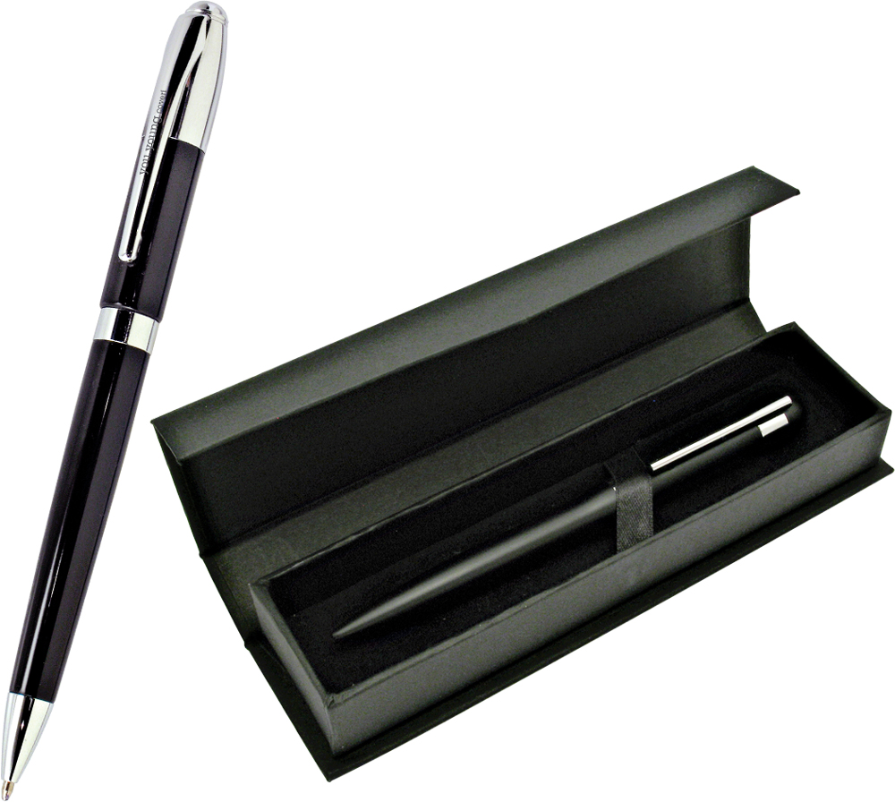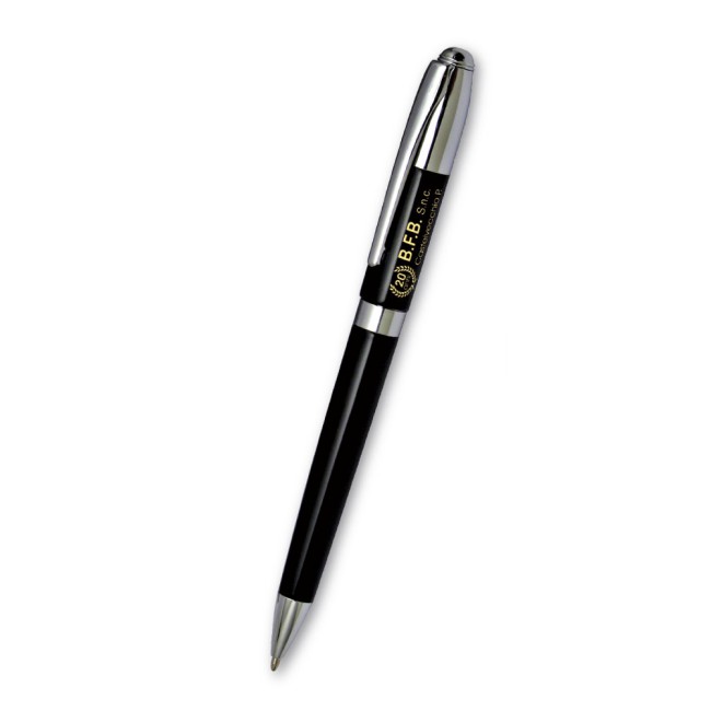 Penna a sfera "You Young Coveri" a rotazione, in metallo laccato nero con finiture cromate, refil blu. Astuccio in cartoncino nero.