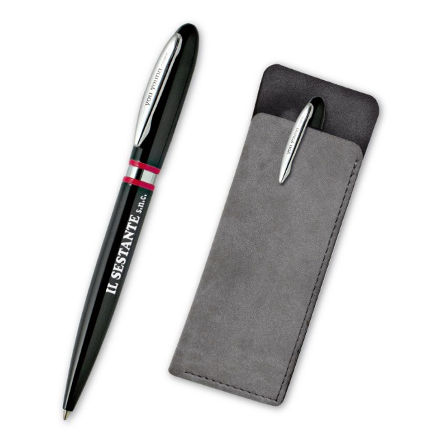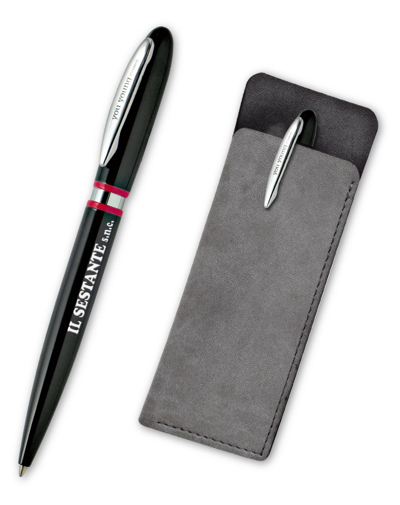 Penna sfera you young coveri a rotazione in metallo nero con profili satinati e partic.rossi in astuccio di pelle refil blu.