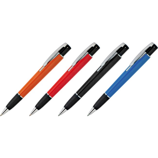 Penna a sfera "WRC" a scatto, fusto colorato, particolari neri e in metallo, impugnatura gommata di colore nero. Refil blu. Astuccio singolo.