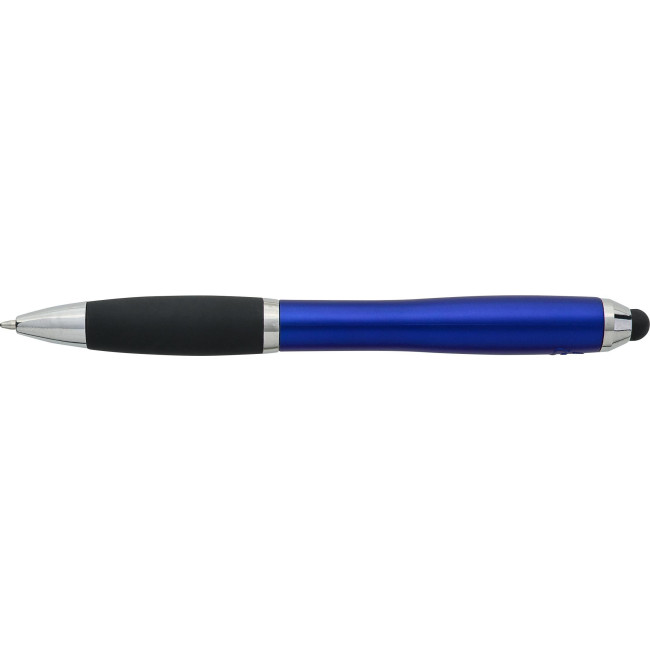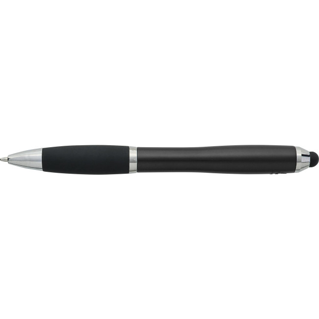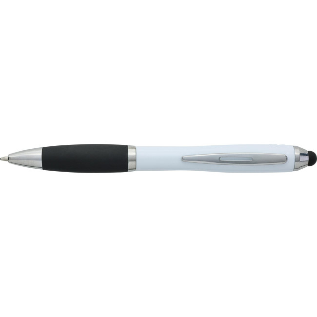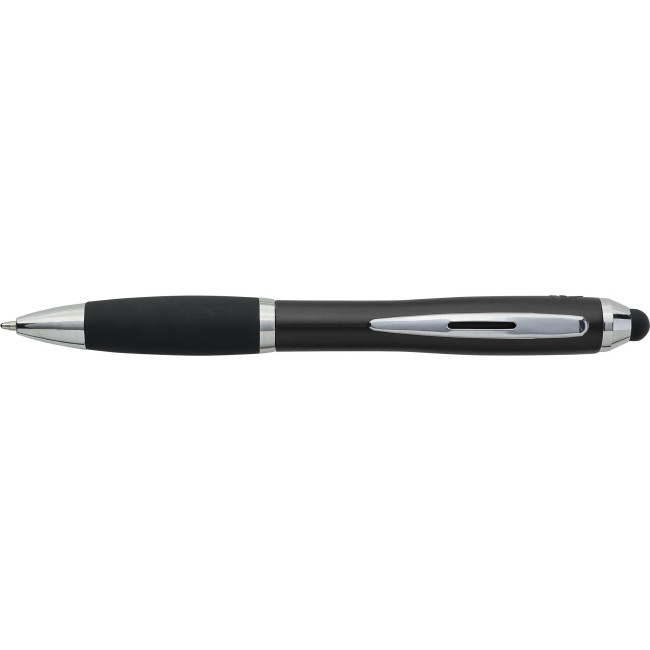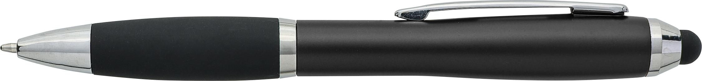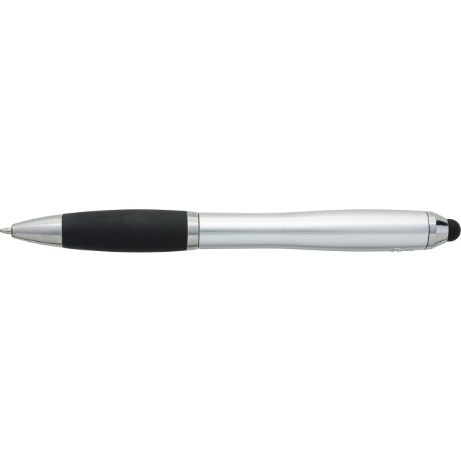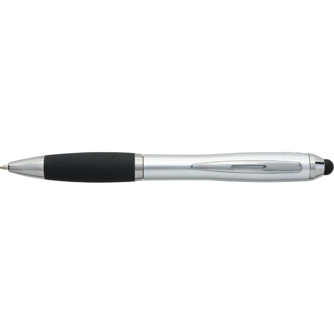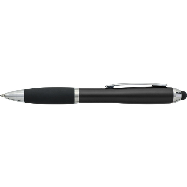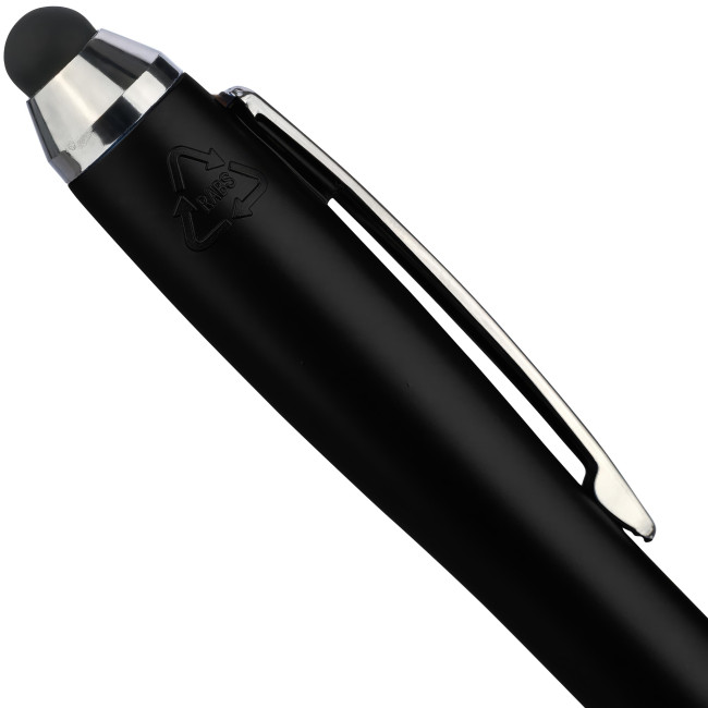Penne a sfera con corpo monocolore, finitura in gomma, dettagli argentati e punta stilo capacitiva nera. Realizzate in ABS riciclato per ridurre i rifiuti di plastica, garantendo al contempo una forte resistenza agli urti e una lunga durata. Dotate di meccanismo a pressione, refill nero e logo riciclato inciso sul fusto.
