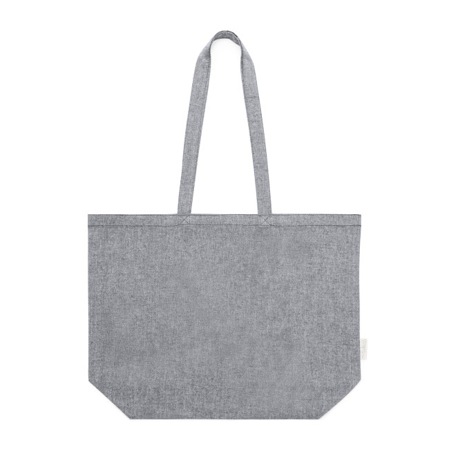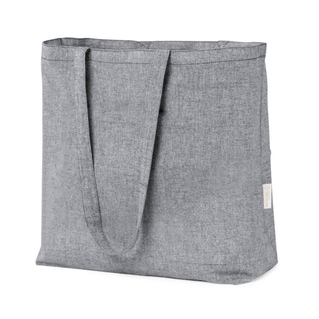 Borsa della linea natura, realizzata in cotone riciclato da 140 g/m2. Finitura cucita e manici lunghi rinforzati (70 x 2,5 cm). Soffietto sulla base e disponibile nei colori naturale e nero, con distintivo in cotone riciclato sull'etichetta esterna. Resistenza fino a 6 kg di peso.Con certificazione GRS (Global Recycled Standard), che garantisce l'origine riciclata del materiale utilizzato per la fabbricazione del prodotto.