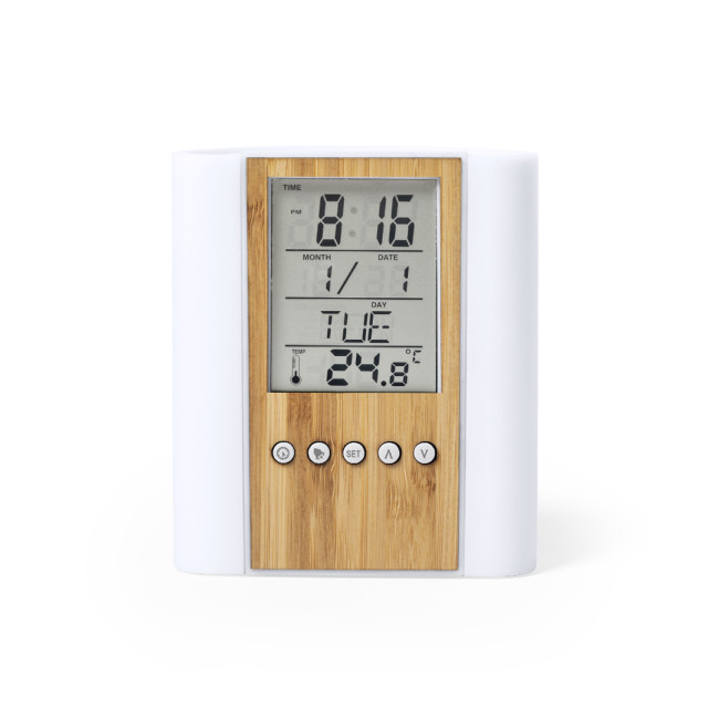 Porta penne della linea Nature con orologio multifunzione integrato. Realizzato con una combinazione di bambù e ABS. Funzioni di termometro, calendario e sveglia timer e promemoria per il compleanno. Alimentato a batteria (a bottone inclusa) e confezionato in un'attraente scatola dal design ecologico. Manuale di istruzioni disponibile in spagnolo e inglese