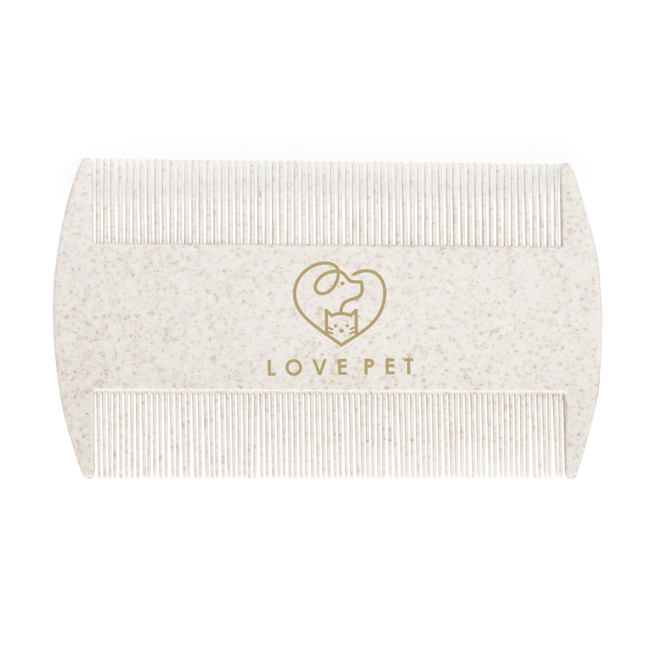 Pettine per animali domestici realizzato in fibra di grano, progettato con due opzioni di spazzolatura per adattarsi a diversi animali. La fibra di grano favorisce l'utilizzo di materie prime naturali, contribuendo a ridurre le emissioni inquinanti. Un accessorio sostenibile per la cura degli animali.