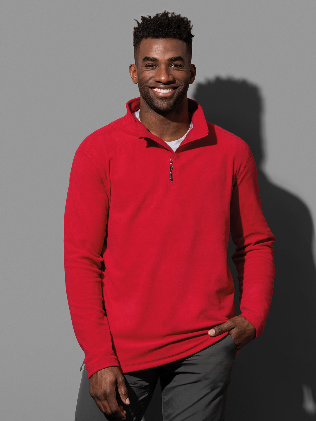 100% poliestere, anti-pilling micro-fleece. Pile con mezza zip tono su tono, cuciture laterali. Cordino aggiustabile in vita.