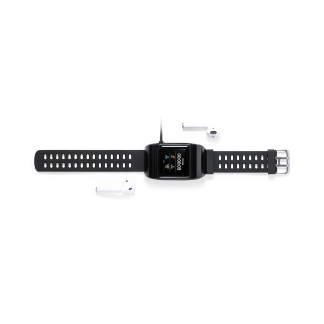 Smartwatch multigadget con auricolari integrati nella cassa. Con connessione Bluetooth® e design casual, cinturino in TPU e schermo touch screen TFT da 1,30 pollici, è il gadget perfetto per ogni tipo di sport, tempo libero e attività quotidiana.Resistente agli spruzzi dacqua, con APP disponibile per iOS e Android. Ricaricabile via USB (cavo incluso) e presentato in una scatola dal design accattivante. Manuale di istruzioni disponibile in spagnolo e inglese.