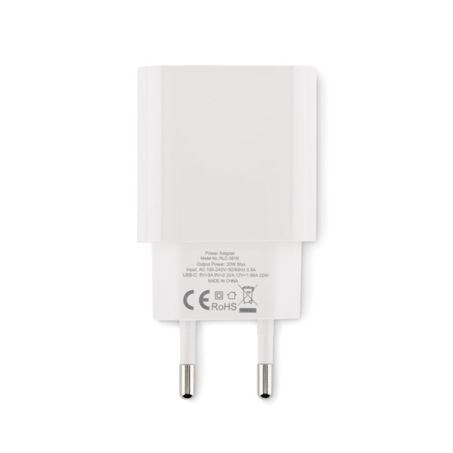 Adattatore/caricatore da parete UE a 2 poli. Supporta la tecnologia di ricarica rapida (20W). 1 Tipo C. Supporta la tecnologia Quick Charge 3.0/Power Delivery. Non adatto all'uso nel Regno Unito.