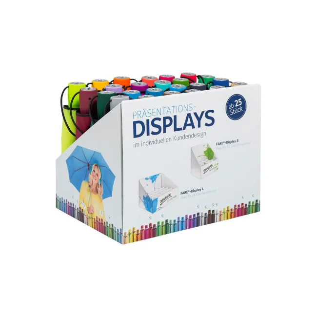 Espositore con 24 mini ombrelli FARE® AOC (art. 5460 in vari colori), cartone plastificato con design "Perfect match", divisione 6x4, adatto per ombrelli con diametro chiuso fino a ca. 5,5 cm. Larghezza: 28 cm, altezza: 34 cm, profondità: 26 cm.