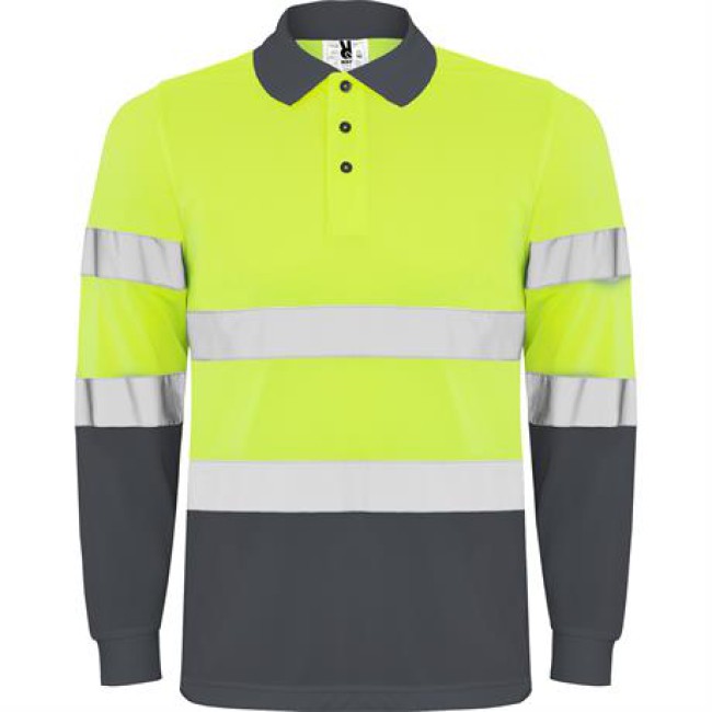 Polo tecnica a manica lunga ad alta visibilità. · Con abbottonatura a 3 bottoni. · Colletto e polsini in costina 1x1. · Due bande orizzontali riflettenti sul torso e sulle maniche. · Tessuto anti-scivolo.