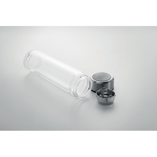 Questa bottiglia in vetro borosilicato a doppio strato può contenere bevande calde e fredde. A differenza del vetro normale, questo non si rompe in caso di sbalzi di temperatura. All'interno c'è un infusore / colino da tè rimovibile per infondere nell'acqua il gusto di frutta o thè preferito. La parte superiore del coperchio ha un termometro touch LED integrato che mostra la temperatura corrente del liquido all'interno. Non vi brucerete mai più le labbra grazie a questa bottiglia. Portatela sempre con voi, è a tenuta stagna, quindi non avrete problemi a trasportarla in borsa. 1 batteria CR2032 inclusa. Capacità: 390 ml. L'incisione laser non è possibile sul vetro borosilicato.