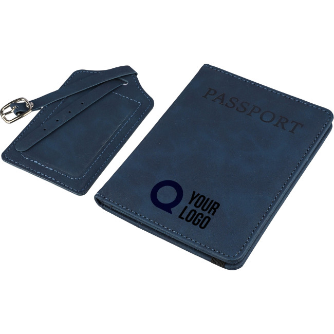 Porta passaporto in PU ed etichetta per bagaglio in PU riciclati, il porta passaporto presenta la scritta “passport” sul davanti e dispone di due tasche interne per contenere in sicurezza il passaporto, entrambi gli articoli sono rifiniti con un logo materiale "riciclato" stampato a caldo, confezionato singolarmente in una scatola in cartone avana illustrata.