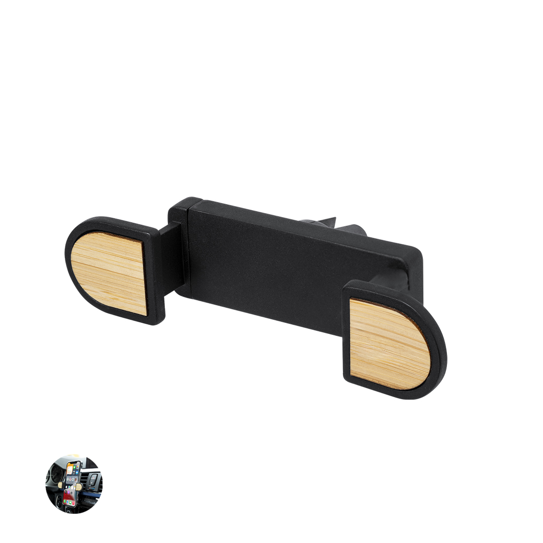 Porta smartphone regolabile dal design minimalista, dotato di base rotante a 360° e finitura nera con dettagli in bambù. Progettato per il fissaggio alla griglia di ventilazione dell'auto, offre un'ampia superficie di stampa per la tampografia. Presentato in una scatola kraft di design, è un accessorio pratico e sostenibile, realizzato con materiali naturali.
