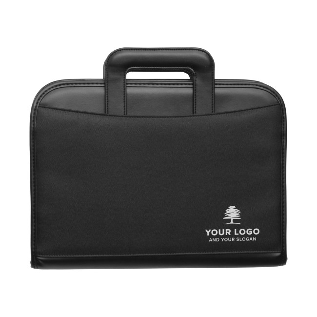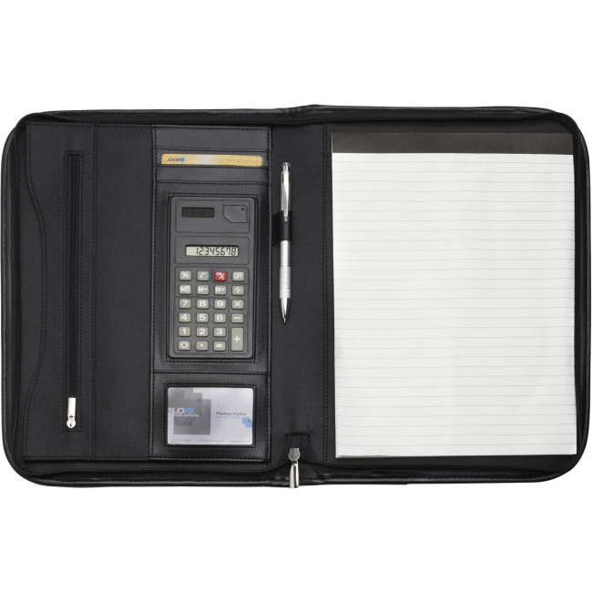 Portablocco formato +/- A4, maniglie retrattili, pannello interno attrezzato, vari scomparti, calcolatrice 8 cifre a doppia alimentazione, vano trasparente, chiusura lampo, passante porta penna, blocco incluso, in microfibra