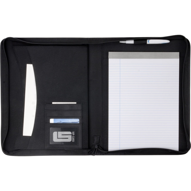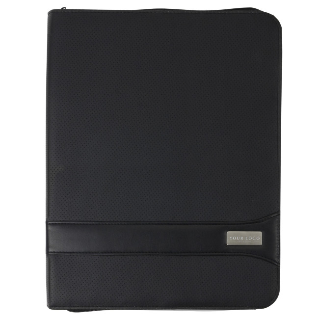 Portablocco formato +/- A4, 2 scomparti grandi interni, 4 vani porta carte di credito, passante elasticizzato per penna, blocco a righe, targhetta in metallo 4x,15 cm applicata sul fronte personalizzabile ad incisione laser, chiusura lampo, in PVC