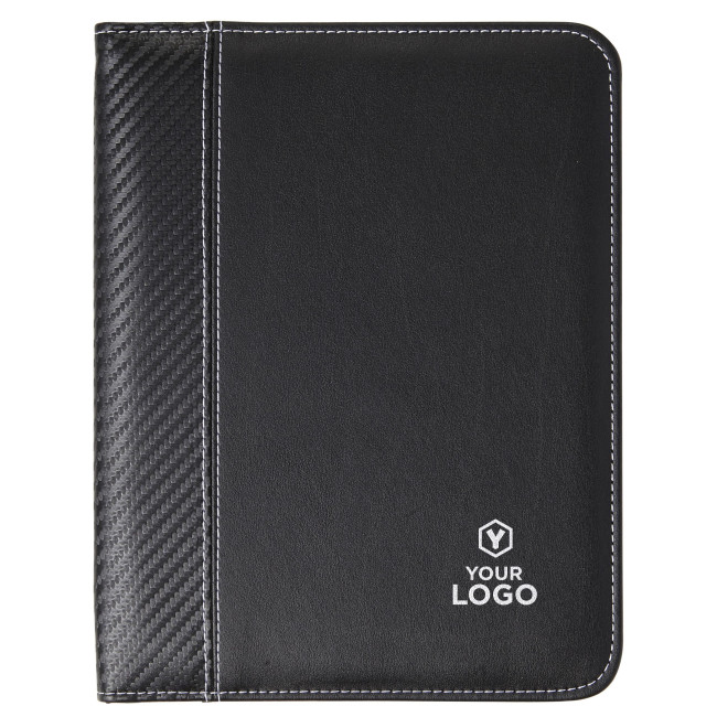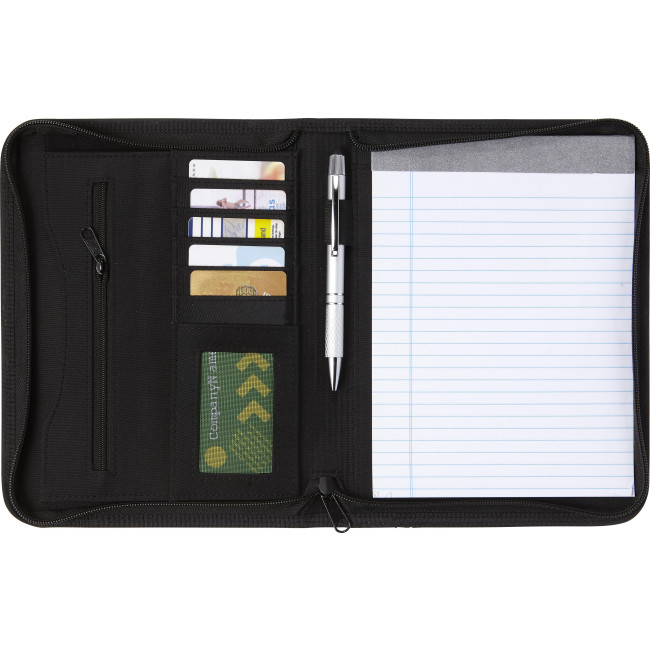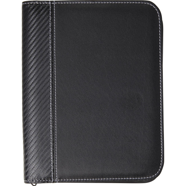Portadocumenti formato +/- A5, rivestimento interno in microfibra, passante per penna elasticizzato (penna non inclusa), blocco con fogli a righe, 6 tasche interne, chiusura lampo, in PU