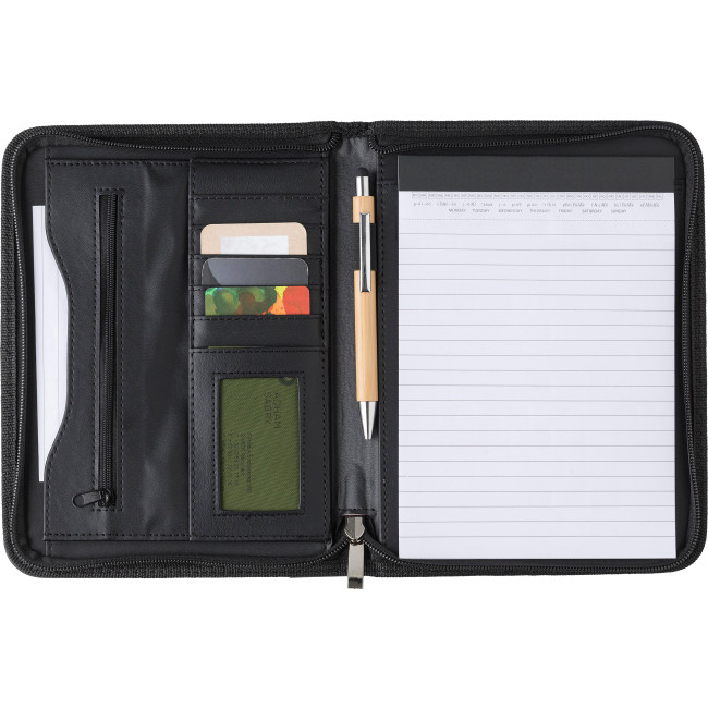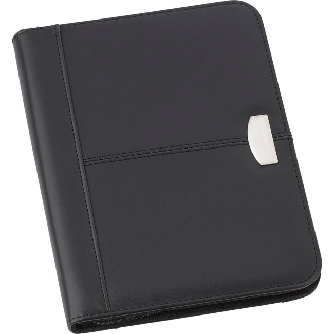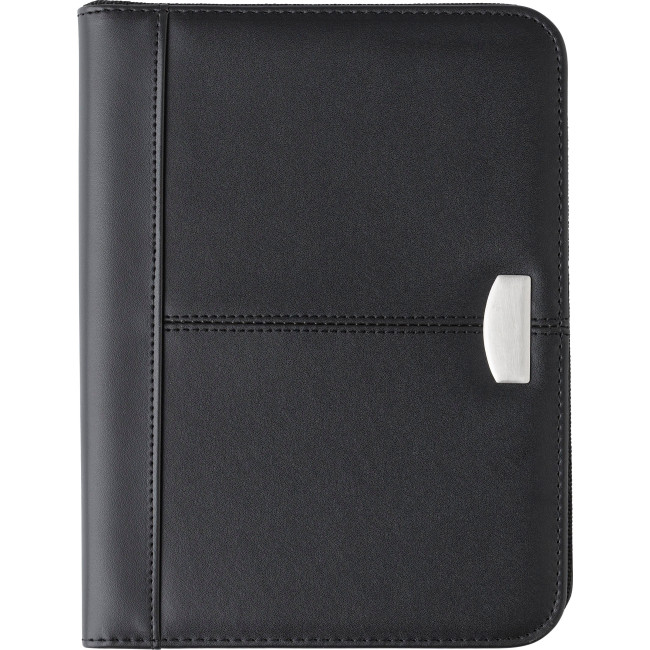 Portablocco formato +/- A5, chiusura lampo, targhetta in metallo, blocco con 25 pagine a righe incluso, passante per penna (non inclusa), in similpelle