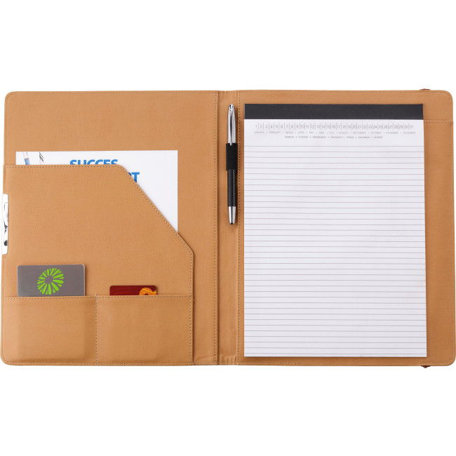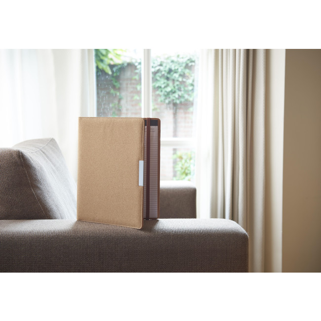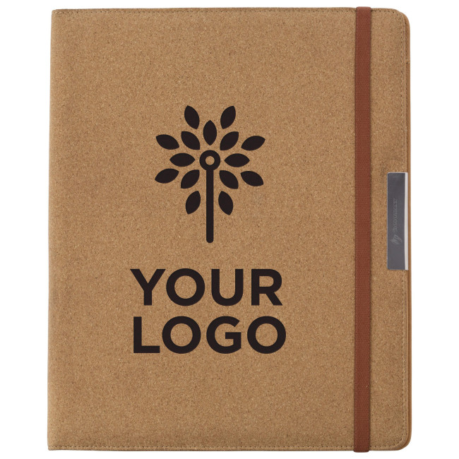 Portablocco formato +/- A4, con targhetta in metallo personalizzabile ad incisione laser, taschina porta carta, passante elastico per penna, blocco con pagine a righe, sughero esterno, PU
