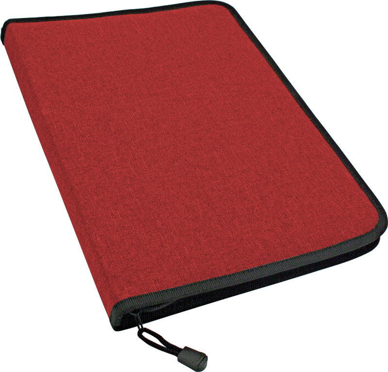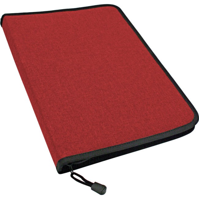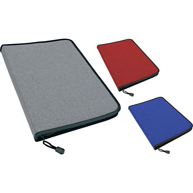Portablocco in poliestere 600D,grigio melange, bordo nero, chiusura con cerniera e asola portapenne.