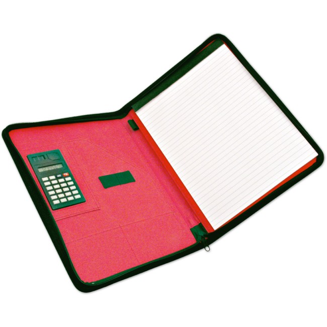 Portablocco in tessuto particolari colorati, chiusura con cerniera sola per penna non fornita,calcolatrice, due tasche interne, blocco carta da 20 fogli confezione in polybag