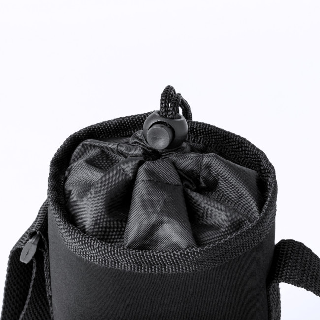 Portabottiglie fino a 1,5L, realizzato in soft shell. Dotato di chiusura a coulisse e tracolla regolabile per un trasporto comodo. Include tasche anteriori con cerniera per riporre piccoli oggetti. Confezionato singolarmente in una borsa riciclata.