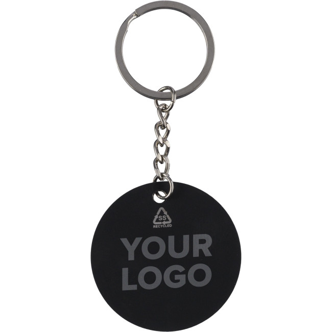Portachiavi in acciaio inox riciclato con rivestimento gommato e anello in metallo, design a forma pallone da calcio, presenta logo materiale "riciclato" inciso a contrasto su superficie lucida a specchio, confezionato singolarmente in una busta di carta kraft.