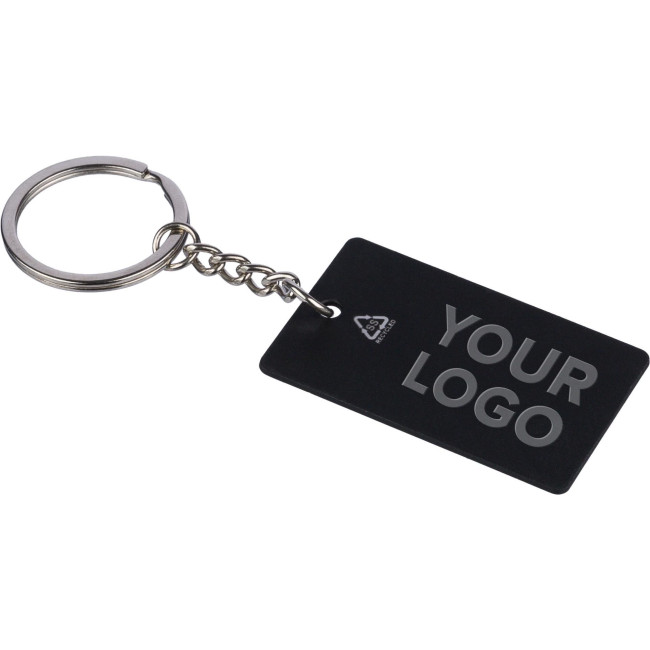 Portachiavi in acciaio inox riciclato gommato con anello metallico, design a forma rettangolare, presenta logo materiale "riciclato" inciso a contrasto su superficie lucida a specchio, confezionato singolarmente in una busta di carta kraft.