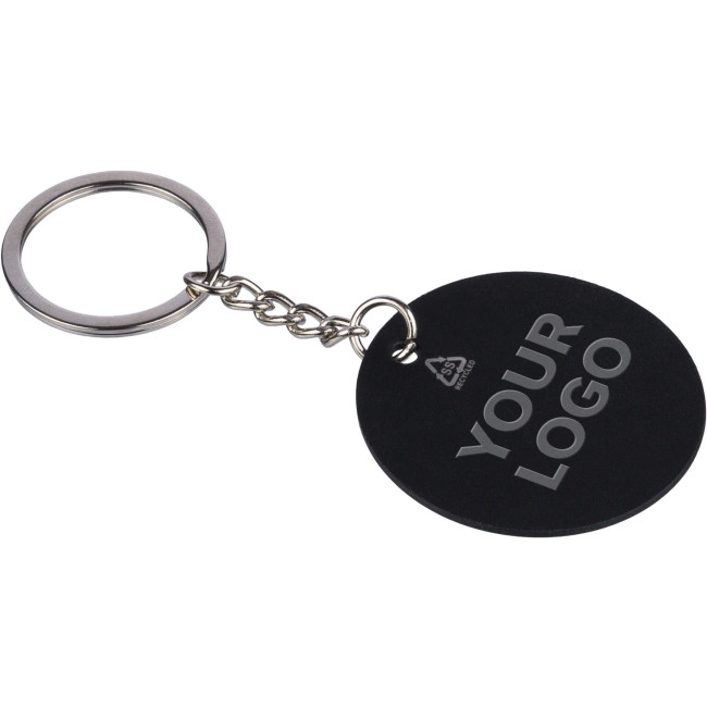 Portachiavi in acciaio inox riciclato con rivestimento gommato e anello in metallo, forma rotonda, con logo materiale "riciclato" inciso a contrasto su superficie lucida a specchio, confezionato singolarmente in busta di carta kraft.
