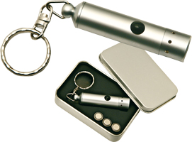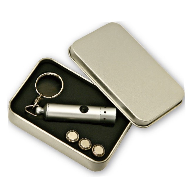 Portachiavi "WRC" con luce in elegante astuccio in metallo, pile incluse. Confezione in scatola di cartoncino.