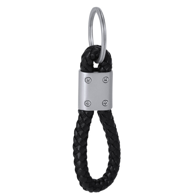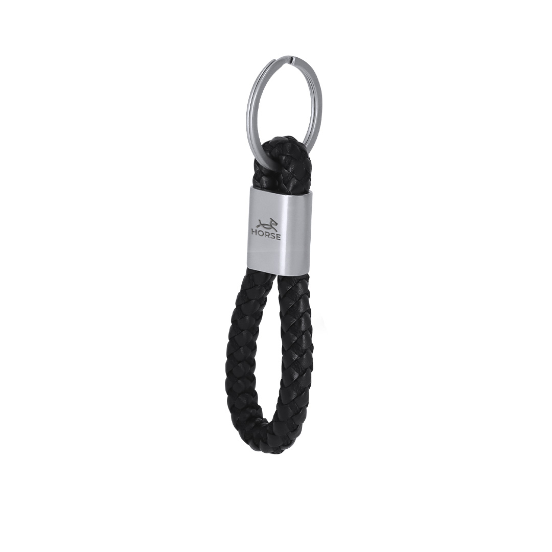 Portachiavi elegante realizzato con cordoncino in pelle PU intrecciata. Include un pezzo centrale in lega opaca, progettato per la marcatura laser, rendendolo un accessorio distintivo e personalizzabile.