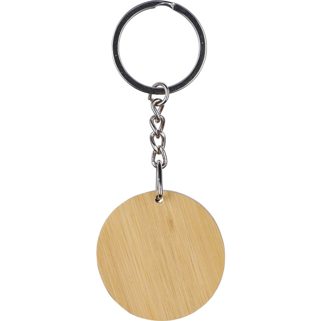 Portachiavi in bambù, all'interno placca adatta per l'incisione in acciaio inox rivestita in gomma nera, forma tonda, il colore dopo l'incisione è cromo lucido, custodia singola in carta marrone