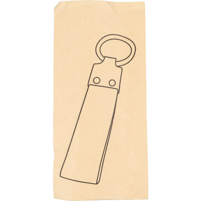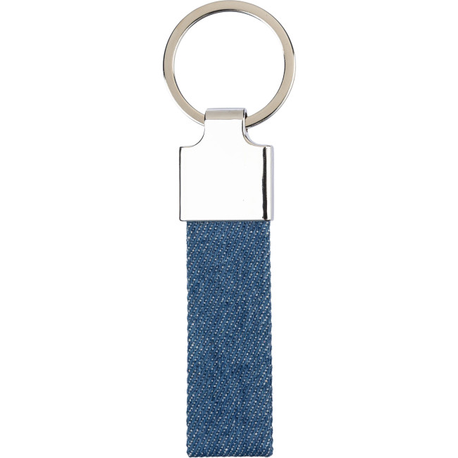 Portachiavi in denim e lega di zinco con un robusto anello in metallo. Combina materiali resistenti per un accessorio elegante e funzionale. Confezionato singolarmente in una custodia di carta kraft.
