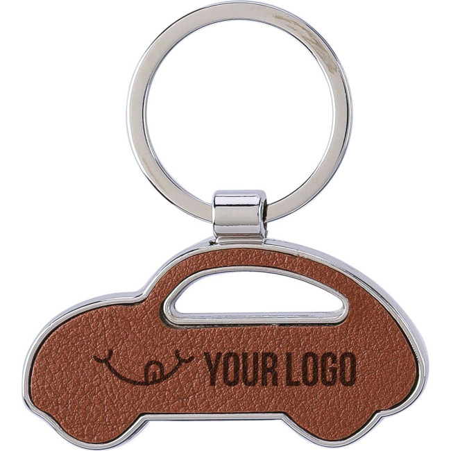 Portachiavi in pelle riciclata a forma di auto, anello in metallo, include goffratura del logo “pelle riciclata” su di un lato, custodia singola in carta marrone