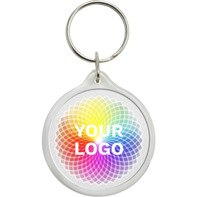 Portachiavi in plastica con anello metallico a forma rotonda.