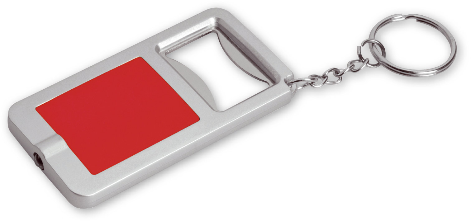 Portachiavi multifunzione, 1 led ad alta luminosit?, con batterie incluese apribottiglia anello in metallo cromato, corredato di astuccio.