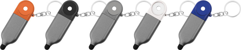 Portachiavi multifunzione dotato di gommino per touch screen, gettone per carrello spesa e mini penna refil nera. Con anello piatto in metallo cromato, questo accessorio è pratico e versatile per ogni esigenza.