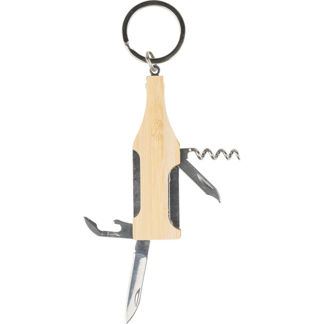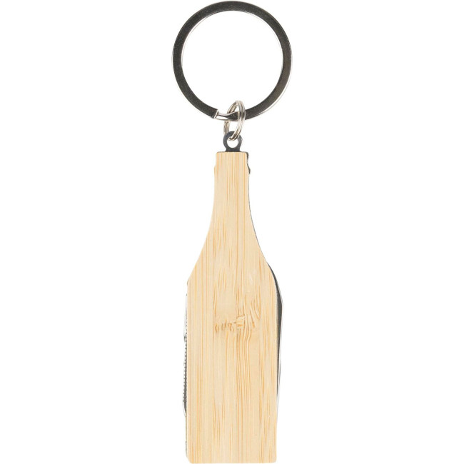 Portachiavi multitools in bambù e acciaio inox a forma di bottiglia con anello portachiavi in metallo, include cavatappi, lima per unghie, apribottiglie e lama, confezionato singolarmento in una scatola in cartone avana.