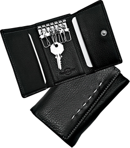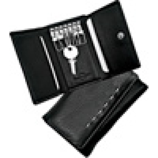 Portachiavi "WRC" in pelle nera. Confezione cartoncino bianco stampato "WRC".