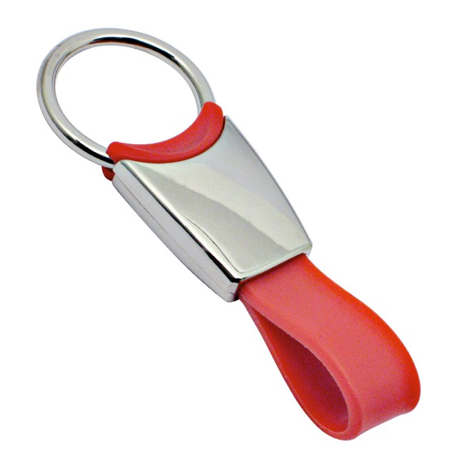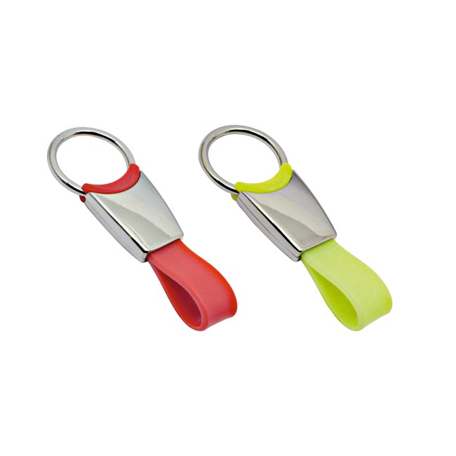 Portachiavi in metallo cromato e particolari in silicone colorato. Confezione in scatola.