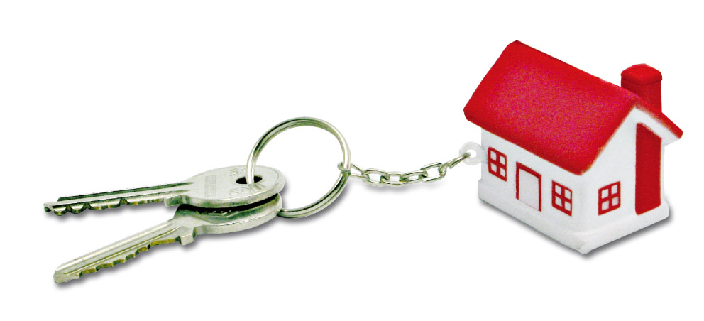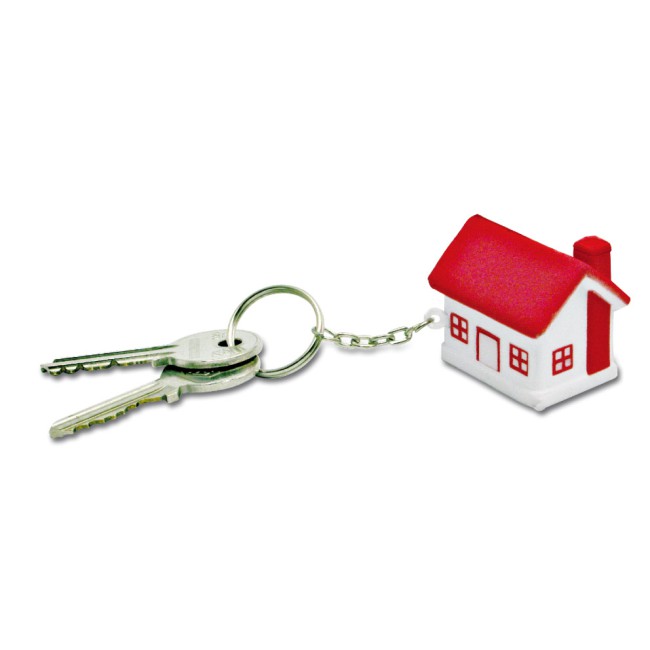 Portachiavi antistress a forma di casetta, in materiale gommoso.