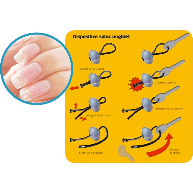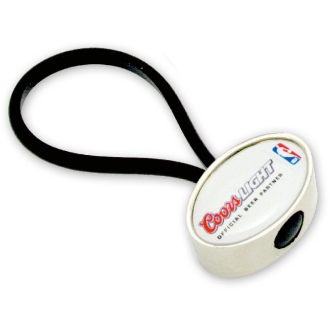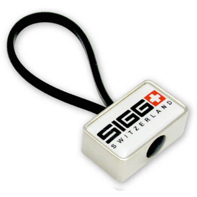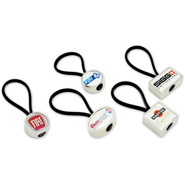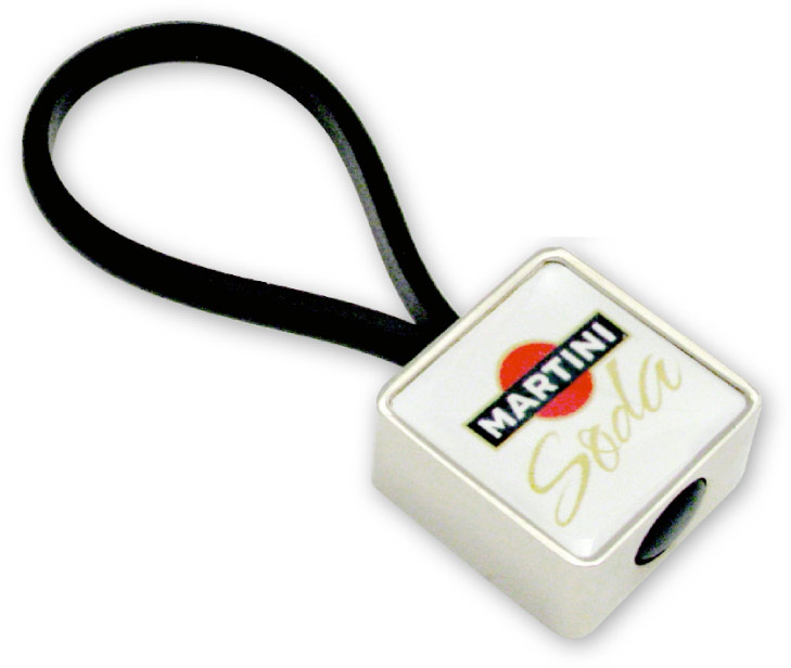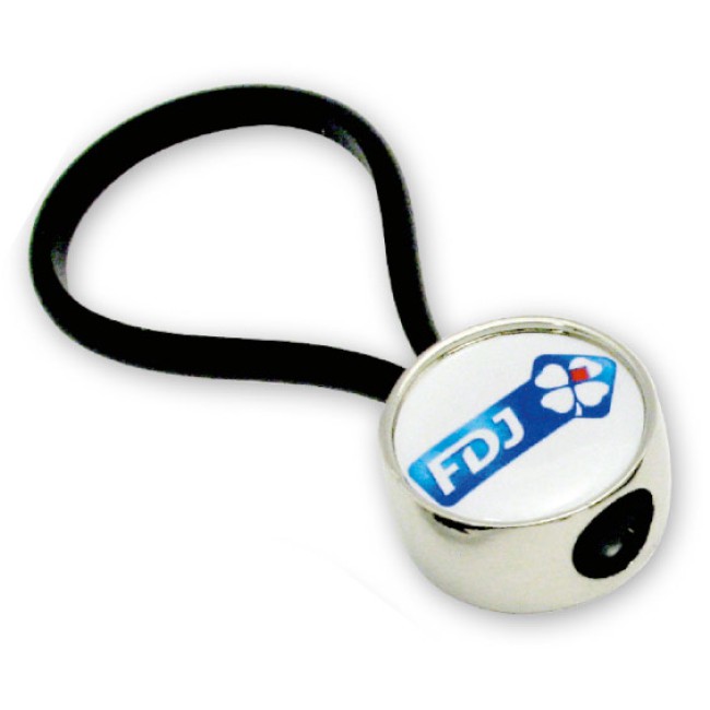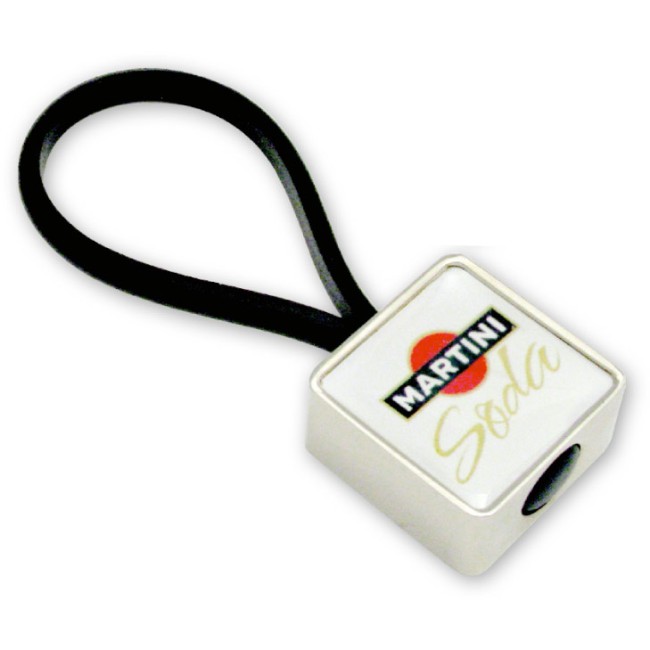 Portachiave in metallo cromato con laccetto in gomma nera.