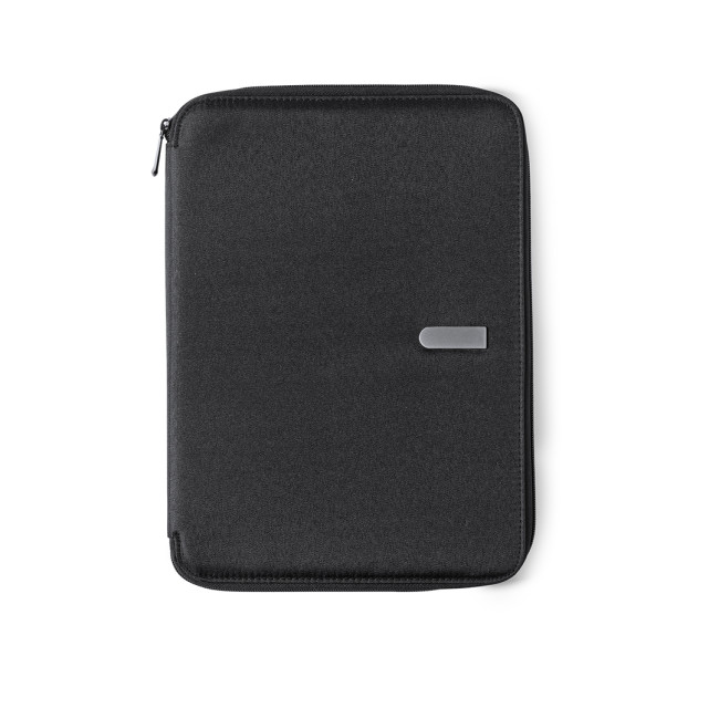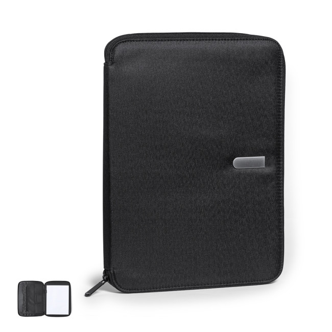 Elegante portadocumenti realizzato in morbida microfibra, dotato di chiusura a zip. L'interno include un blocco removibile da 20 fogli a righe, tasca con cerniera, tasca con patta, portacarte e portapenne. La targhetta metallica sul fronte consente la stampa laser per personalizzazione.