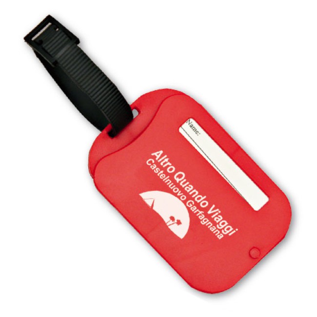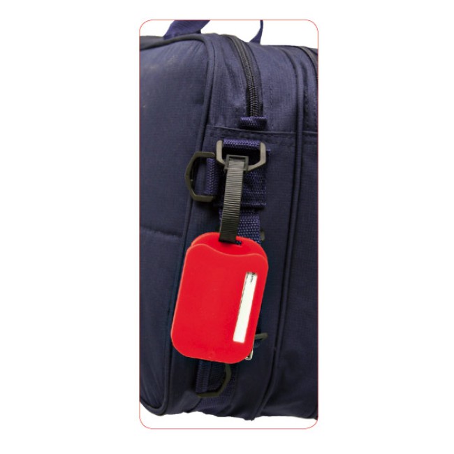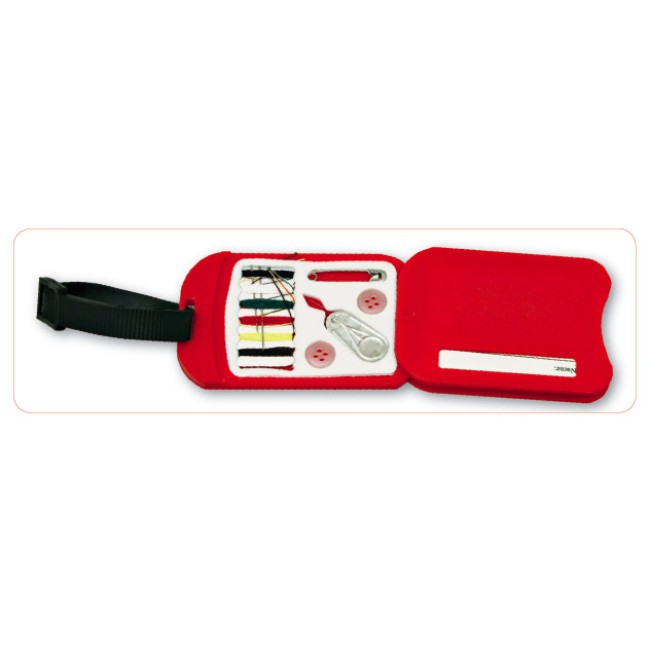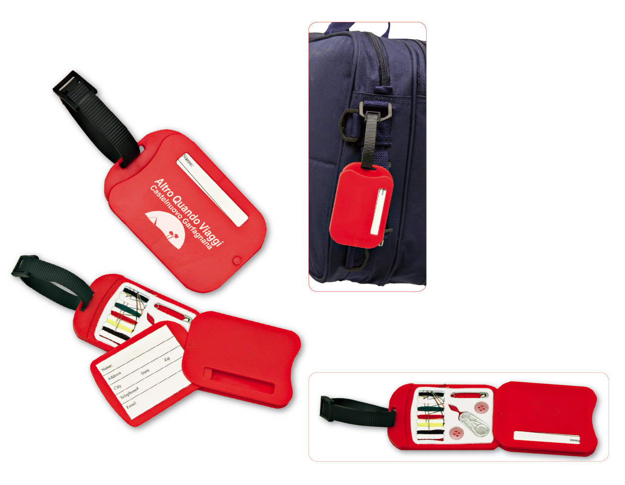 Portanome per bagaglio in plastica rosso con all'interno set da cucito