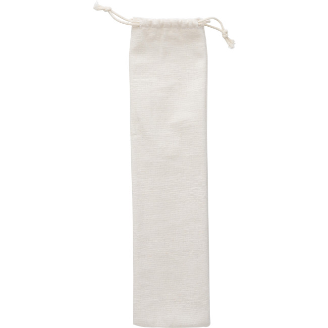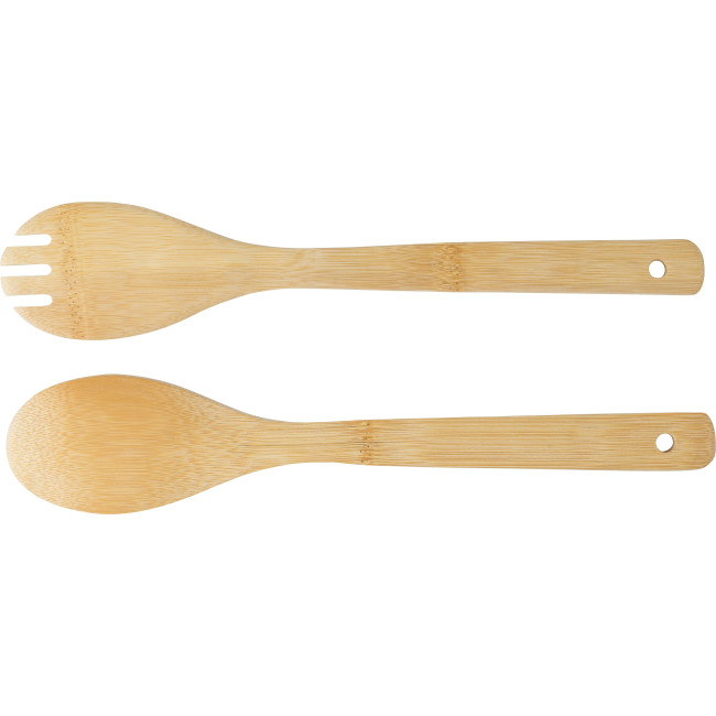 Posate da insalata in bambù, fori all’estremità del manico, confezionati in sacchetto di cotone con chiusura a coulisse