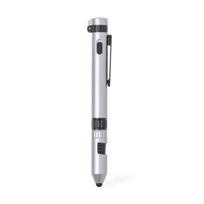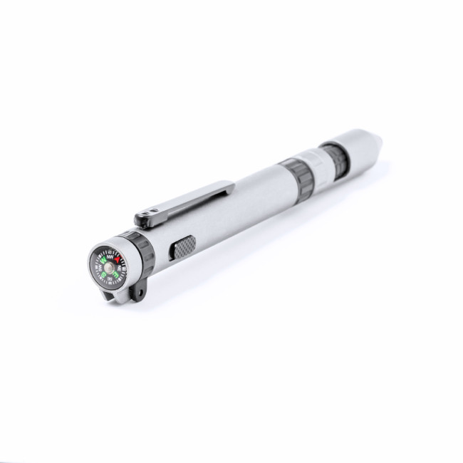 Pratica penna multifunzione con 7 usi. Include: portacellulare, stilo, penna a inchiostro blu, torcia alimentata da una batteria a bottone (inclusa), bussola, cacciavite piatto e a croce. Confezionato singolarmente in una scatola kraft di design.