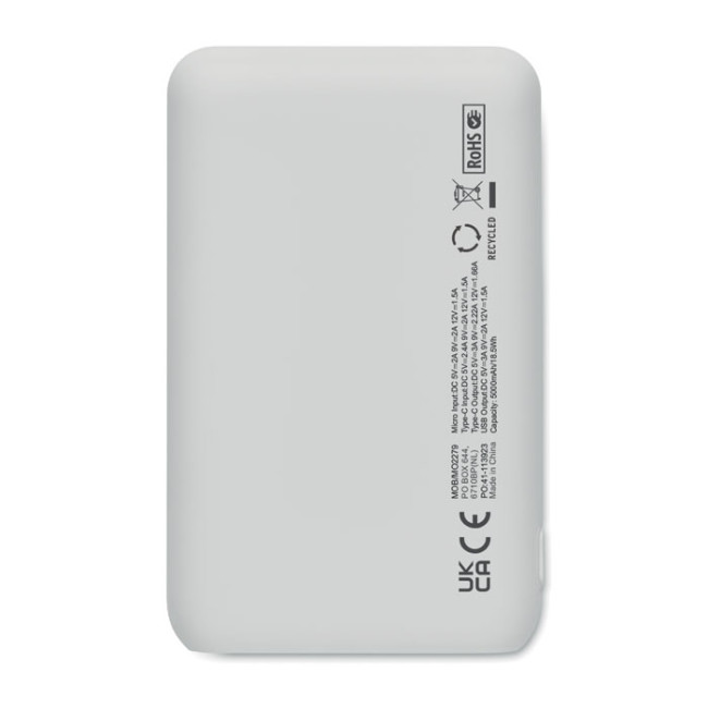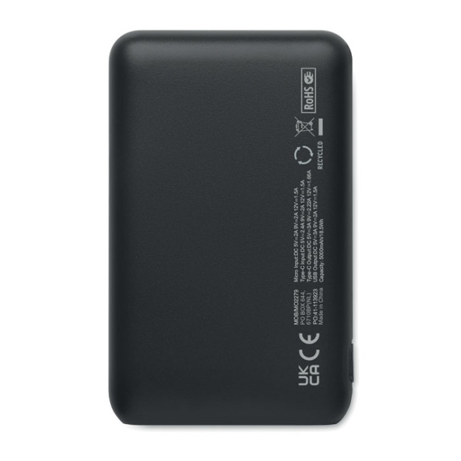 Power bank da 5000 mAh in ABS riciclato. Capacità per uso smartphone, Uscita: 1 x Tipo-C, 2 x Tipo-A e 1 x Tipo-B. Ingresso: 2 in 1 tipo C e tipo A.