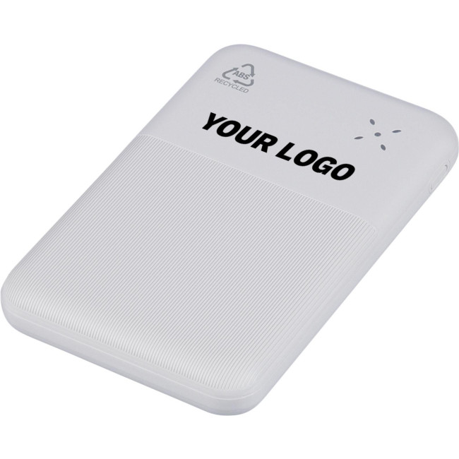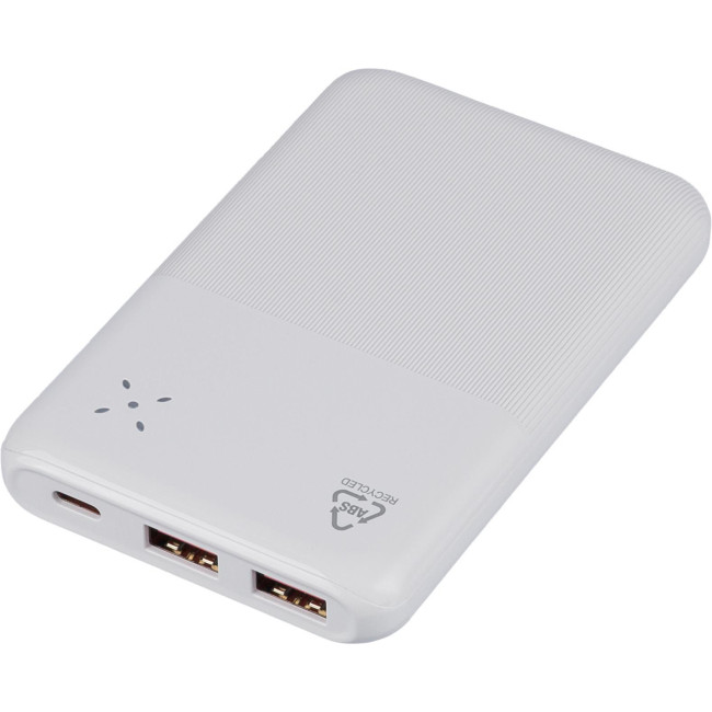 Powerbank in ABS riciclato con batteria Li-ion da 10.000?mAh e ricarica rapida da 22,5W, dispone di ingresso e uscita Type-C, e ingresso Type-A. Il design del corpo presenta un terzo con superficie liscia lucida per la stampa e due terzi con texture a rilievo, è dotato di display digitale sulla parte superiore per mostrare la capacità della batteria. Offre protezione contro il surriscaldamento, cortocircuito, sovratensione e sovracorrente ed include un’etichetta sul retro con il logo "ABS riciclato". Confezionata singolarmente in una scatola in cartone avana avvolto in carta velina all'interno.