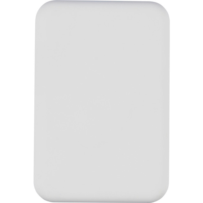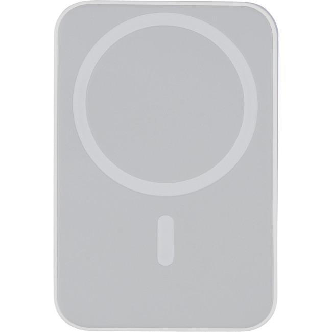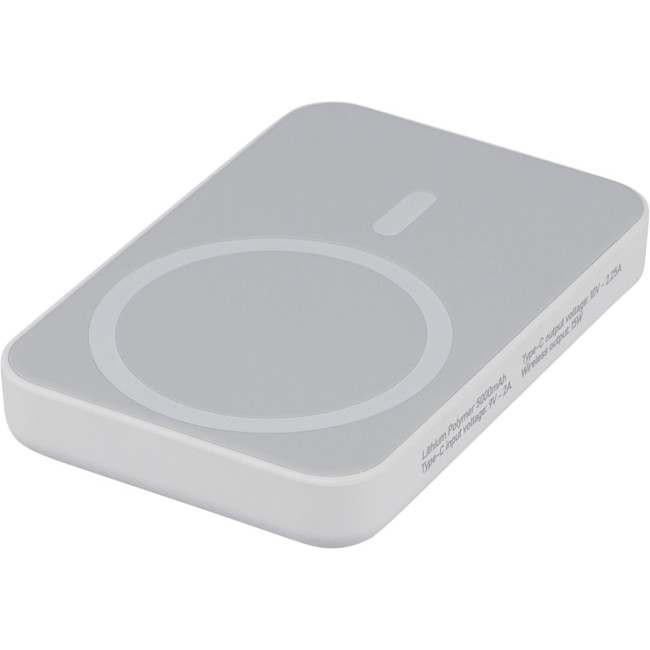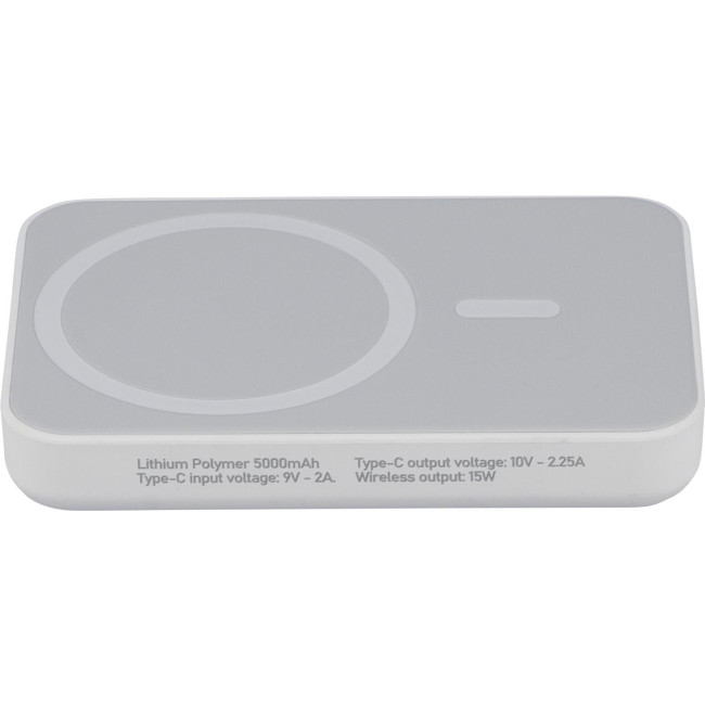 Powerbank wireless in ABS riciclato con batteria Li-ion da 5.000?mAh e ricarica magnetica wireless da 15W, compatibile MagSafe, dispone ingresso Type-C fino a 20W e uscita Type-C: DC5V/3A, DC9V/2.22A, DC12V/1.67A. Dotato di protezioni contro surriscaldamento, cortocircuito, sovratensione e sovracorrente, con arresto automatico in caso di surriscaldamento, include un anello metallico adesivo per abilitare la ricarica wireless su dispositivi non compatibili con MagSafe e presenta etichetta laterale con logo "ABS riciclato" (RABS).Confezionata singolarmente in una scatola in cartone avana avvolto in carta velina all'interno.