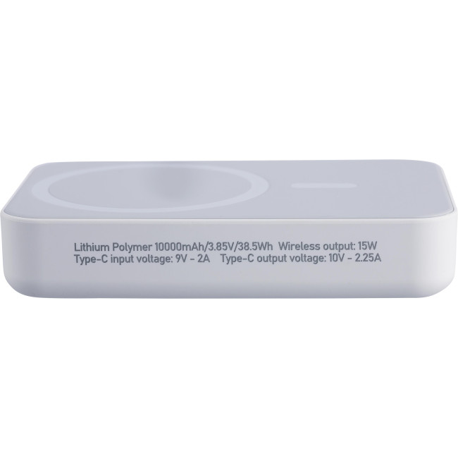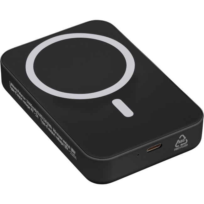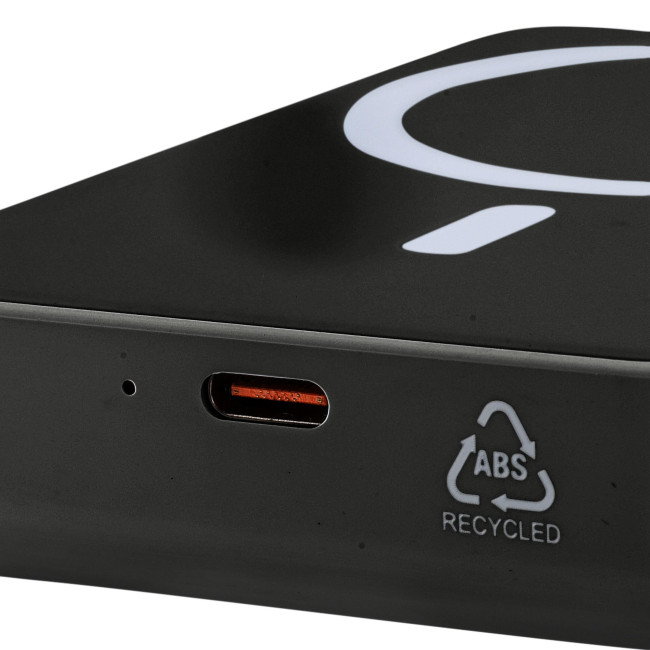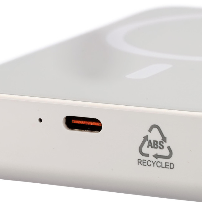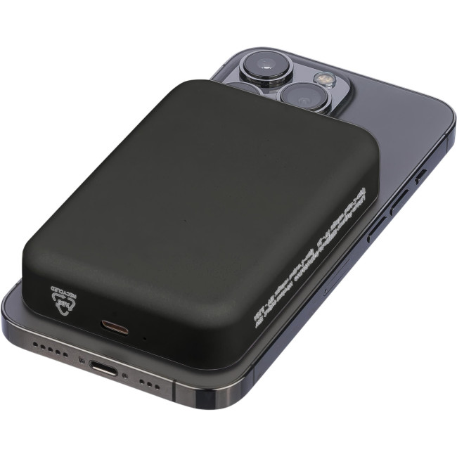 Powerbank ricaricabile wireless riciclato con batteria da 10.000 mAh e potenza di 15 W, compatibile con MagSafe. Dispone di ingresso/uscita Type-C e protezione integrata contro surriscaldamento, cortocircuito, sovratensione e sovracorrente. Include anello metallico, supporto adesivo e confezione senza plastica.