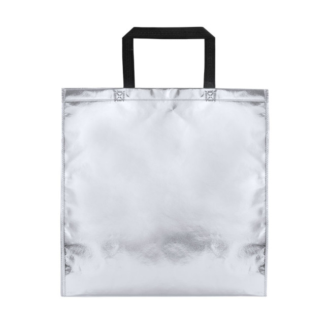 Borsa in TNT laminato con finitura metallizzata. Disponibile nei colori oro, argento e oro rosa. Con manici medi rinforzati lunghi 42 cm. Finitura termosaldata, con soffietti e bordini rinforzati. Resistente fino a 7 kg di peso.