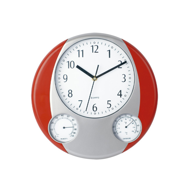 Orologio da parete analogico dal design circolare, con termometro e igrometro integrati. Alimentazione a batteria: tipo AA non inclusa e confezionato singolarmente in una scatola.