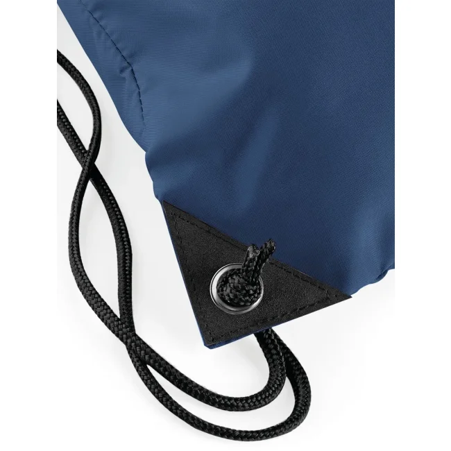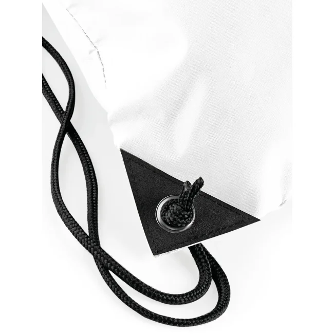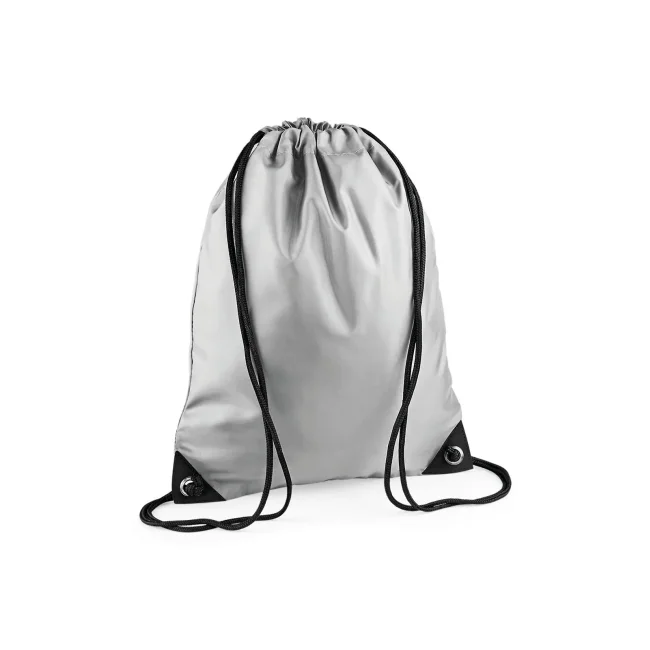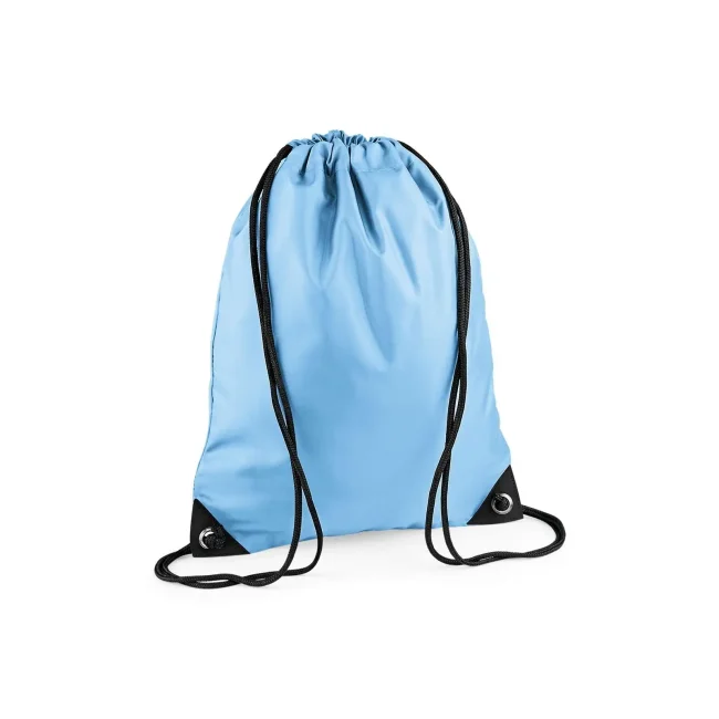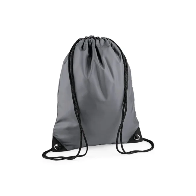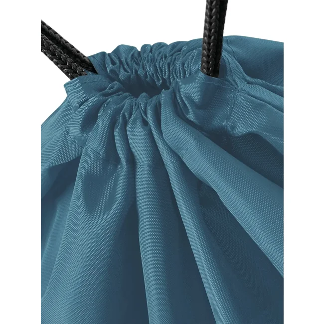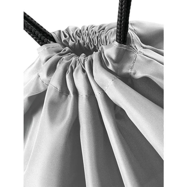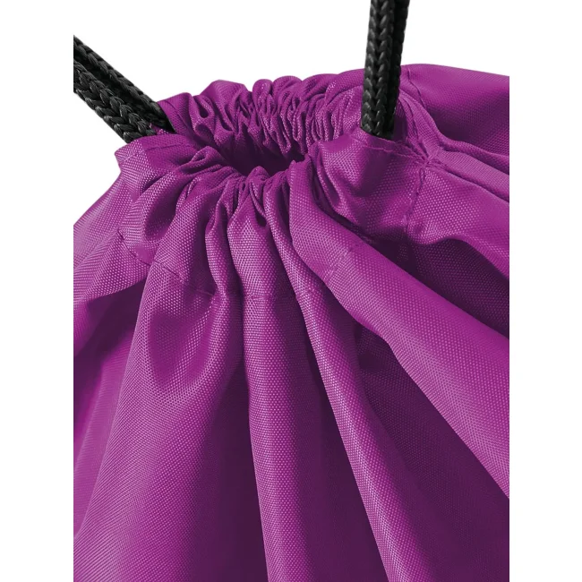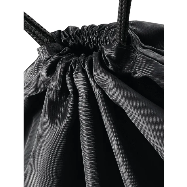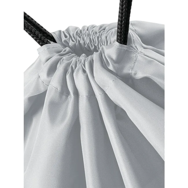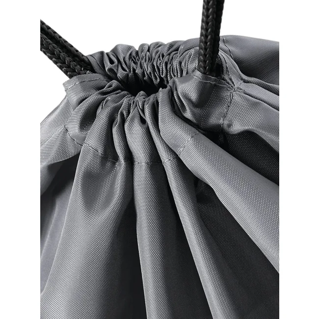 100% poliestere 210d. Sacca con cordoncini. Tessuto resistente all'acqua 100 g/m². Angoli rinforzati con occhielli color canna di fucile (argento- nylon 210D). Etichetta removibile. Dimensioni: 33 x 45 cm, capacita': 11 litri, area stampabile: 29 x 26 cm.